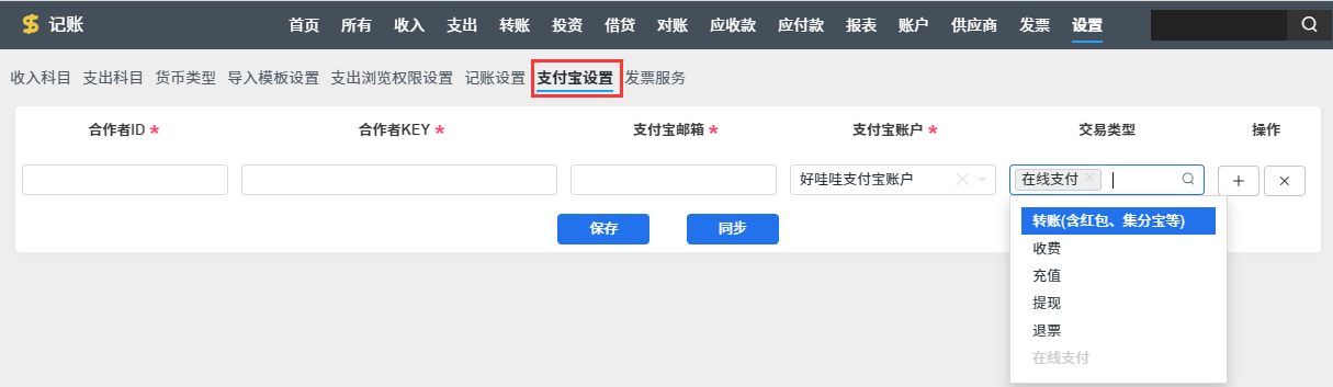 1、现金记账---設置---支付宝配置,点击 “同步”。