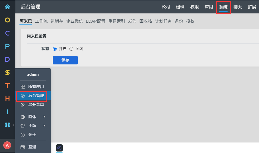 超級管理員進入ZDOO後台管理應用的系統模塊,點擊阿米巴菜單,可以進入阿米巴啓用界面,如下圖所示: