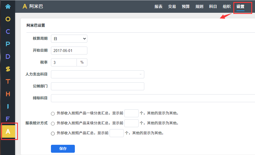 3、税率:税率主要用于根据外部收入自动计算应缴税额。此处只能設置一个通用税额。因为在阿米巴应用中可能有多个部门都有外部收入,而企业缴税一般是联网缴税账户自动扣除,并不会区分是具体某个部门的业务缴税,所以需要設置税率来自动计算应缴税额。