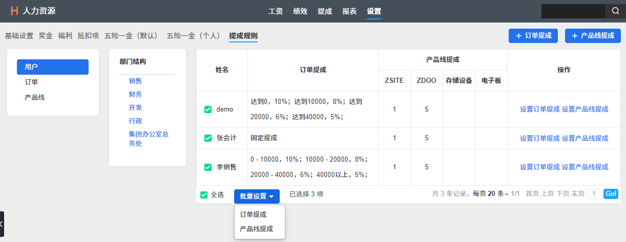 - 可以单独設置每个用户的提成规则,也可以选中多个用户批量設置。