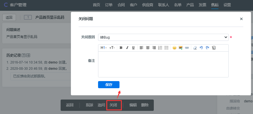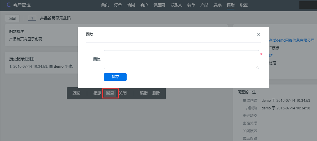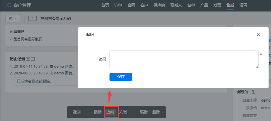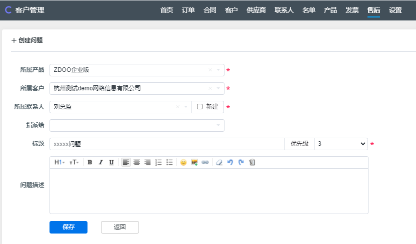 选择客户管理--售后,根据反馈客户的信息录入问题,必须关联産品、客户、联系人。可选择优先级,用于处理人员判断处理顺序。