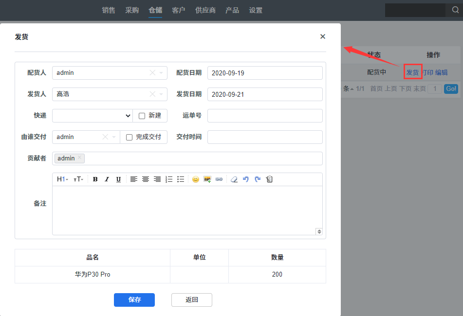 在待發貨列表选择要發貨的订单,点击“發貨”按钮录入相应的發貨信息,如果订单是由CRM合同创建而来,可以录入合同交付的相关信息。如果快递不存在可以直接录入新的快递名称。