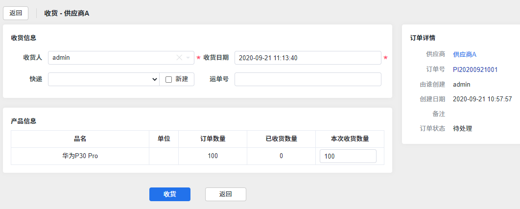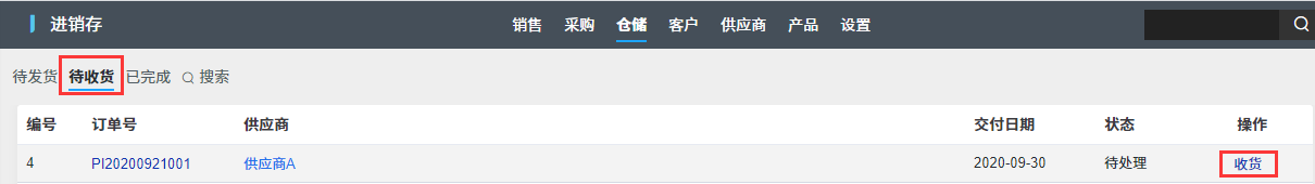 在待發貨列表选择要收貨的订单,点击“收貨”按钮录入相应的收貨信息。