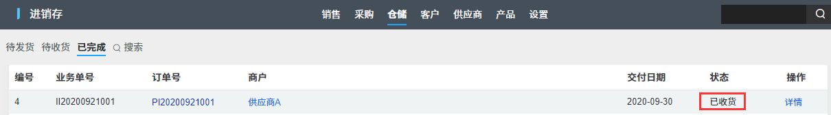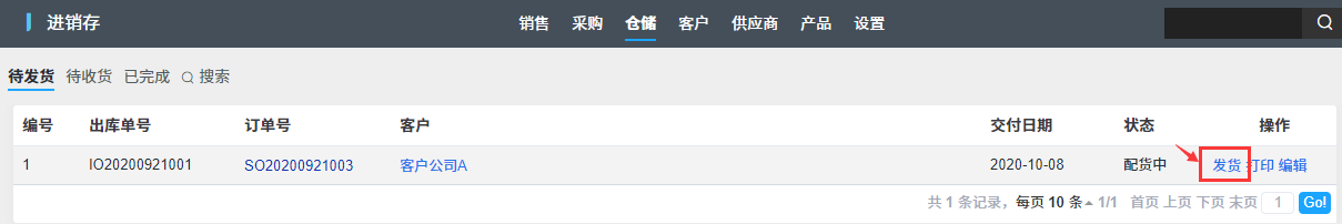 銷售人员通知配货之后在倉儲模块下待發貨列表中会显示待發貨的订单,采購人员创建采購单之后在待收貨列表中会显示相应的采購订单。