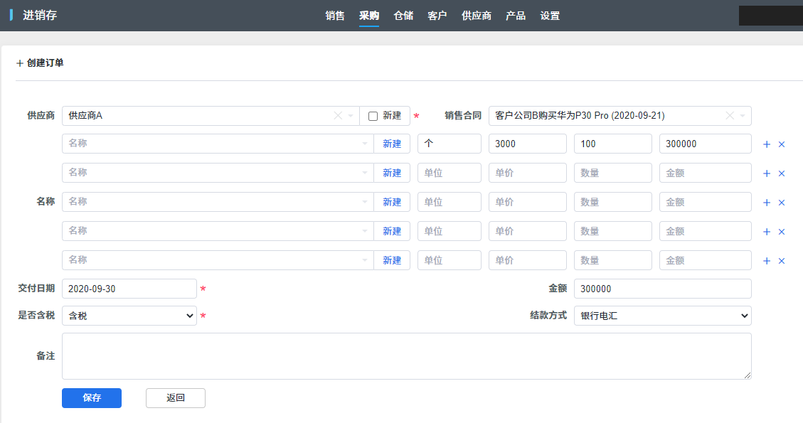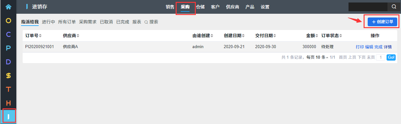 進銷存中的采購单来源有三种方式,一种是在采購模块直接创建,第二种是在采購需求列表选择需要采購的産品创建,第三种是通过CRM的合同创建。