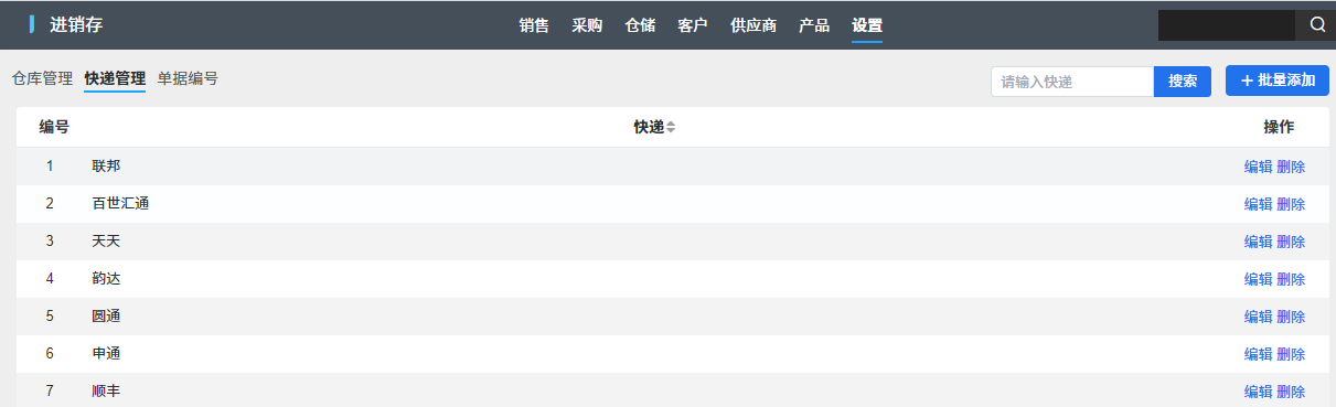 設置菜单下主要提供对倉庫、快遞、單據編號三种基础资料的管理功能。其中倉庫、快遞功能可以通过权限管理划分给普通用户,單據編號只能由超级管理员設置。