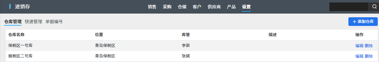 倉庫管理功能主要对倉庫进行增删改查的操作,功能比较简单不再赘述。