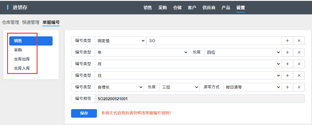 單據編號中提供了銷售、采購、出库、入库四种业务类型的编号方式。設置單據編號的时候需要注意, 至少選擇一項編號類型爲自增長,否则生成的單據編號会出现重复的号码。另外为了保持编号格式的统一,如果需要修改编号格式应该在上一业务年度结束之后再进行修改。