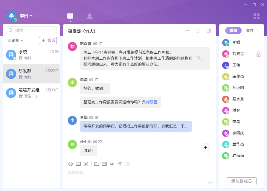 支持多人聊天的功能,可將討論組公開,任何成員都可以自由加入。